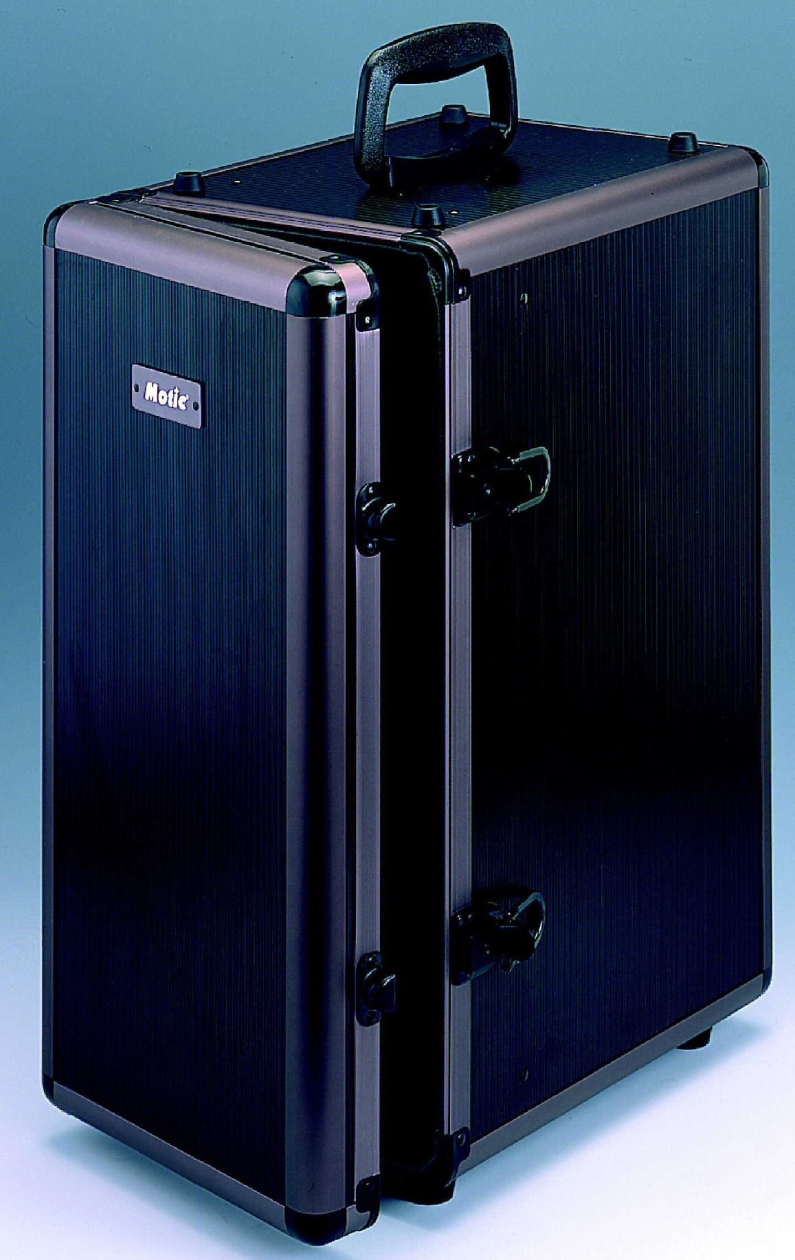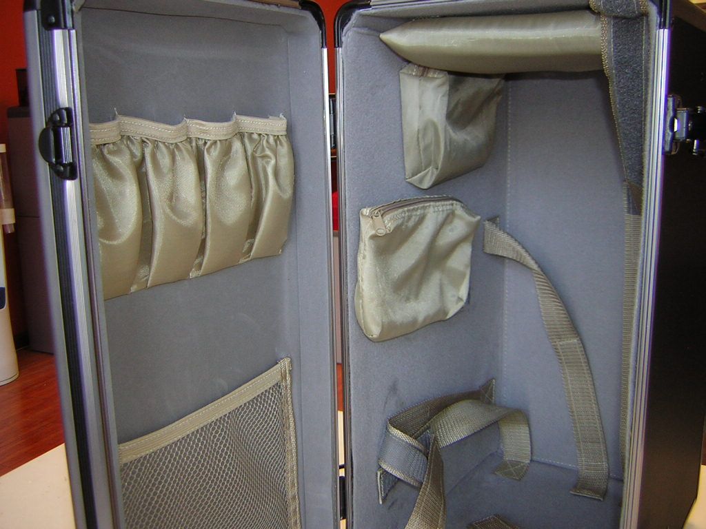 Alumiininen kantolaukku mikroskoopille. Sisällä remmit mikroskoopin kiinnitykseen. (klikkaa kuvat oikealta suuremmaksi) Taskut pienen tavaran säilyykseen. Sisämitat: n. korkeus 38cm x leveys 19cm x syvyys 26cm